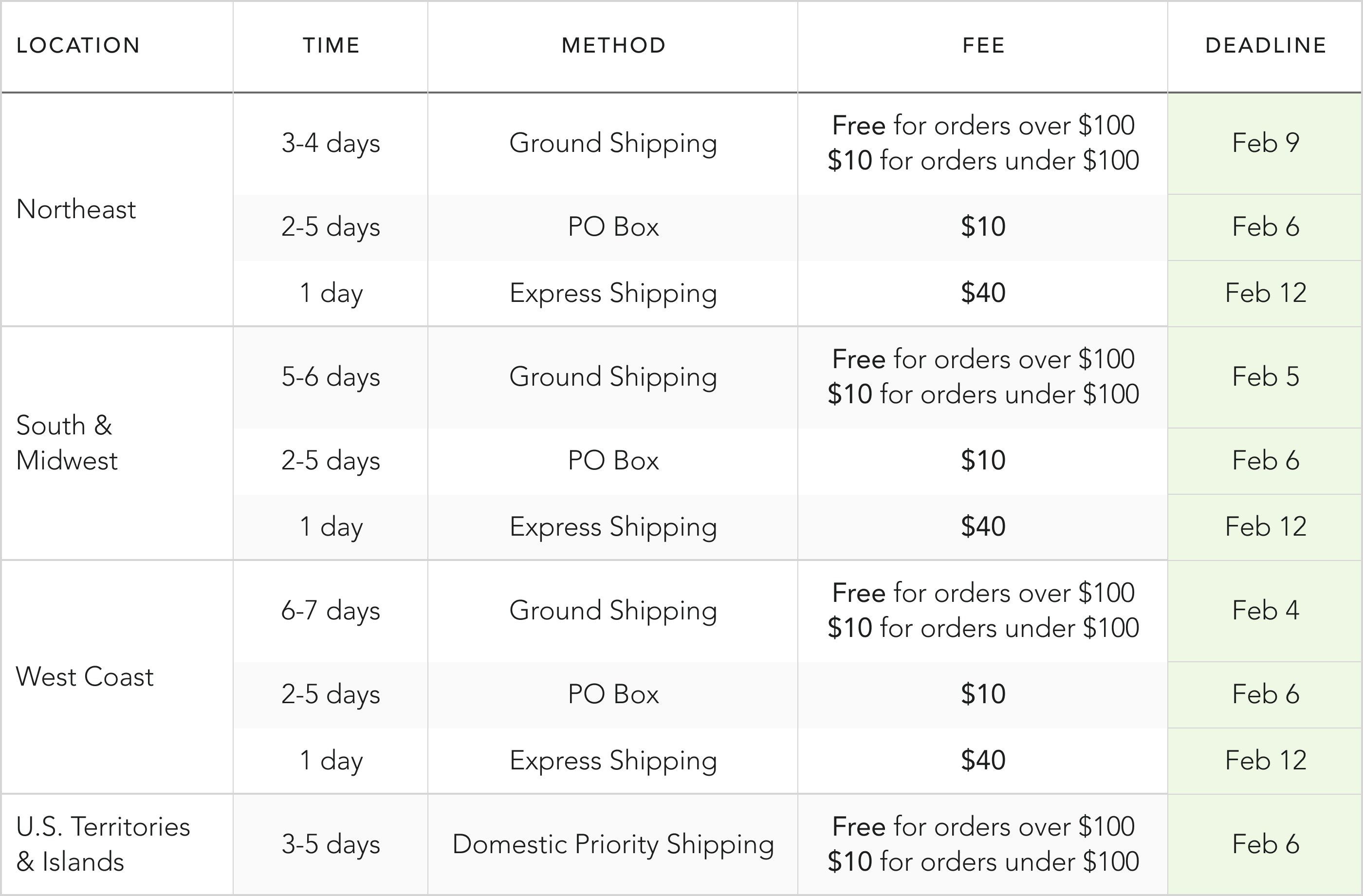 Delivery time is quoted in business days. Order before 1PM ET on the Valentine's Day Order Deadline to receive your shipment by February 13th.
