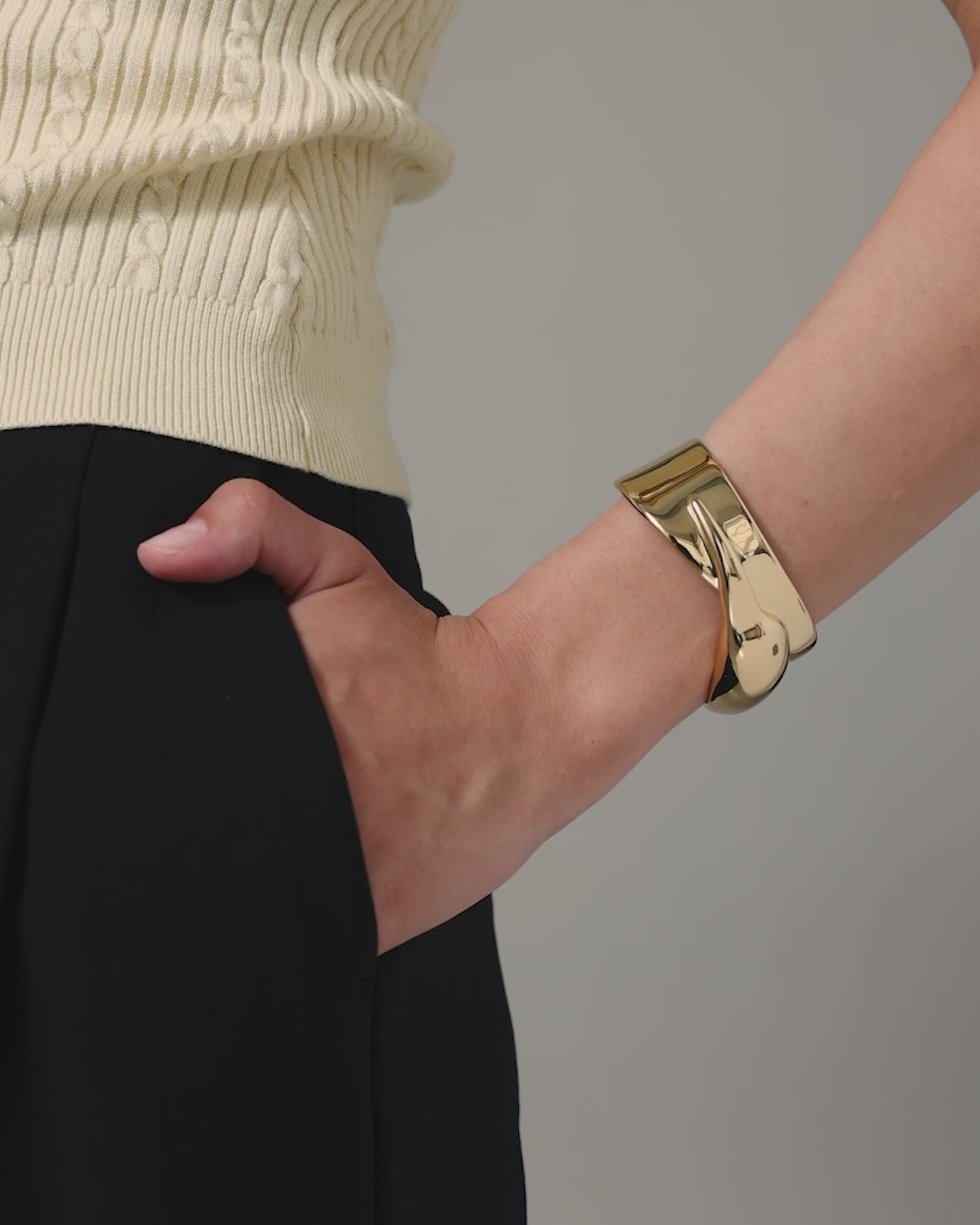 The open-ended cuff bracelet boasts a bold, fixed structure and showcases the theatrical profile of the egret bird. Available in two sizes and finished in high-polish gold.