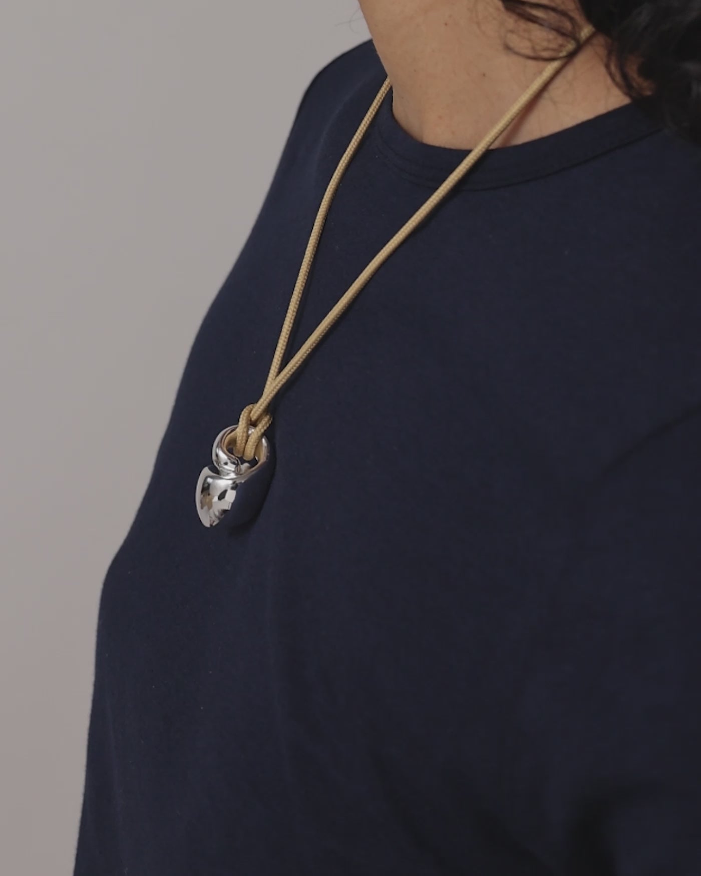 Folds of metal wrap around negative space. This pendant is finished in high-polish silver and hangs from a sand colored cord made of recycled polyester.